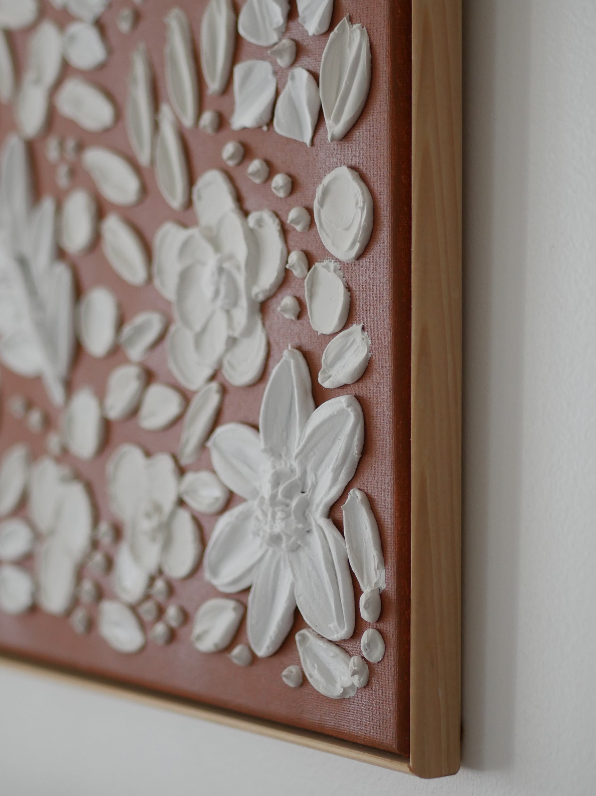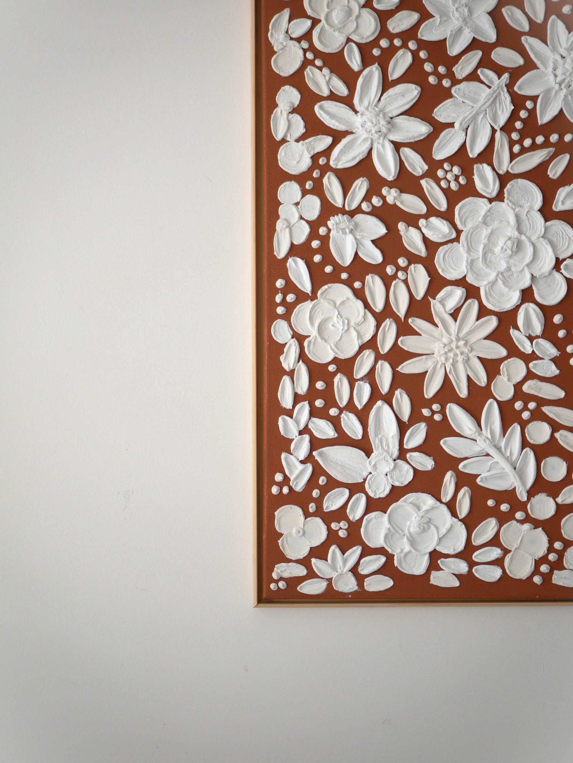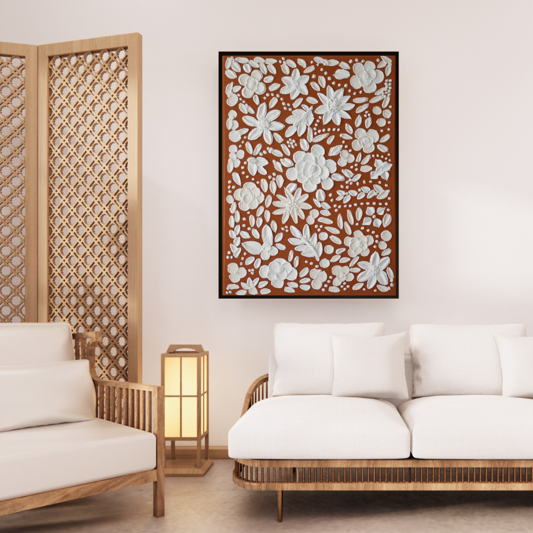 Cette œuvre célèbre la beauté des fleurs en relief, sculptées à la main et disposées en bouquet sur un fond profond et solaire. Chaque détail, chaque pétale en blanc pur contraste harmonieusement avec le fond terracotta, créant une composition à la fois moderne et poétique. Idéal pour apporter une touche de nature et de douceur à votre intérieur, tout en s’intégrant parfaitement à votre nouvelle collection inspirée par la terre et la mer.