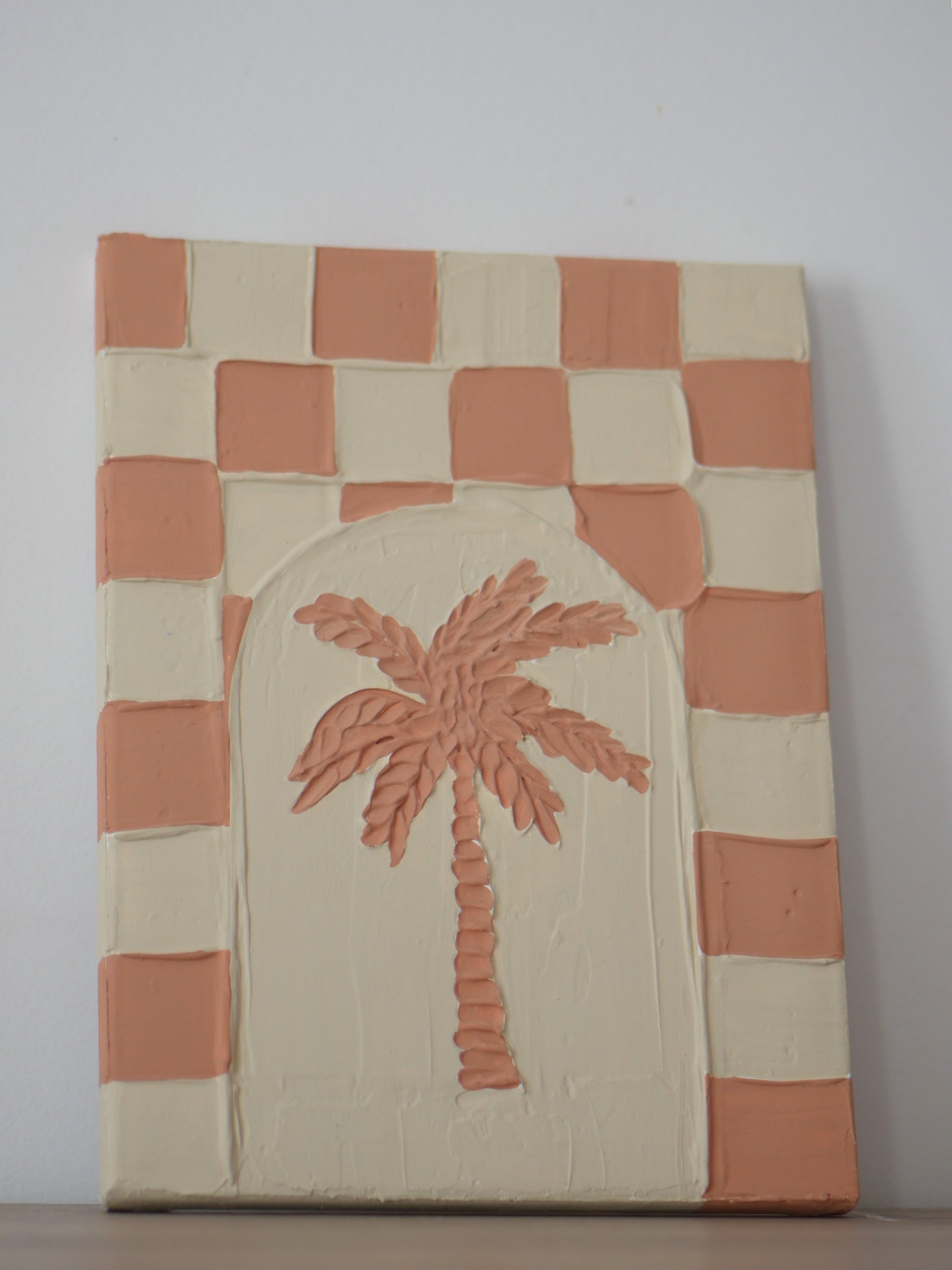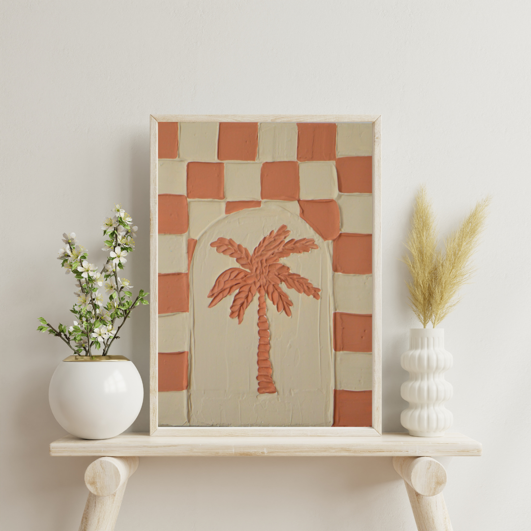 Ce tableau unique met en scène un palmier en relief, entouré de carreaux corail pastel et crème, pour un style à la fois artisanal et résolument moderne. Inspiré par les architectures méditerranéennes et l’esprit bohème, il s’intègre parfaitement dans une déco contemporaine, ethnique ou naturelle.