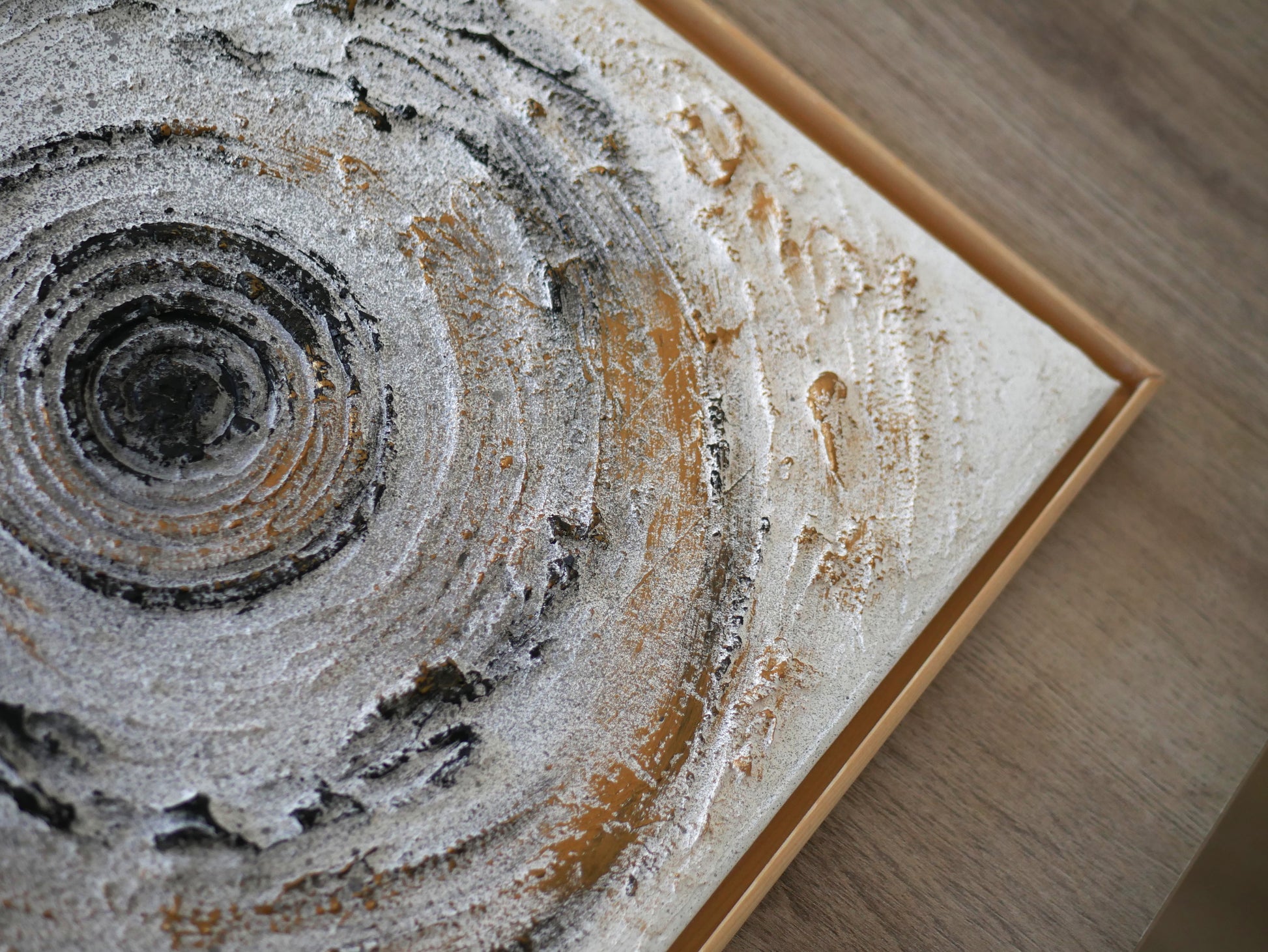 Les cercles concentriques et les touches d’ombre et de lumière évoquent la profondeur de la terre, la force tranquille de la nature et la beauté des textures brutes. Un tableau qui habille l’espace avec élégance et caractère, parfait pour un intérieur contemporain ou bohème.