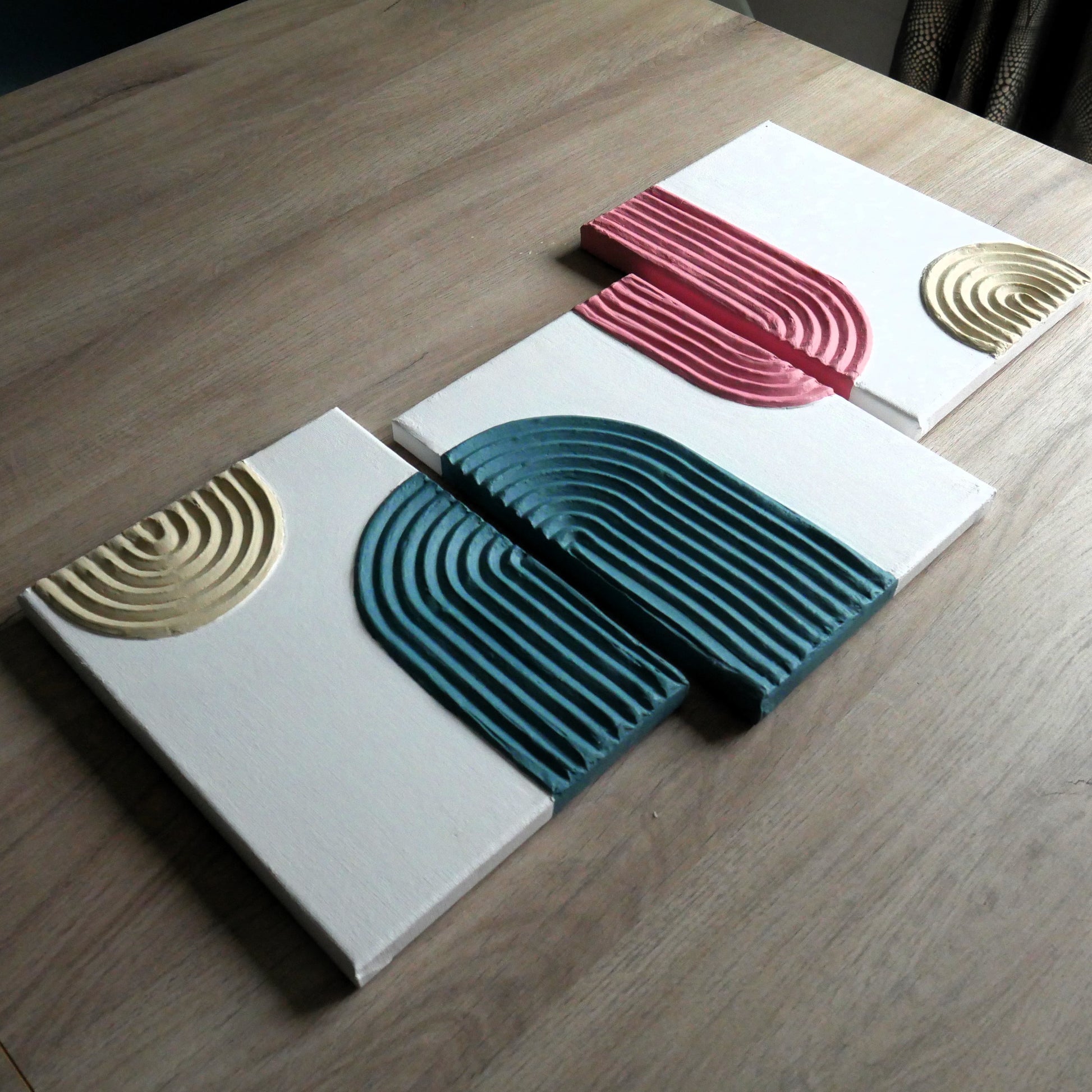 Éveillez vos sens avec notre trio de tableaux texturés "Douceurs de Santorin", une addition délicieuse à notre collection inspirée par les paysages et l'architecture enchanteresse de l'île de Santorin. Ce trio irrésistible présente des motifs géométriques en relief, rappelant les formes courbées et les passages emblématiques de l'île, avec des nuances apaisantes de bleu, beige et rose pastel, ce qui évoque une douceur visuelle qui invite à la détente et à l'évasion.